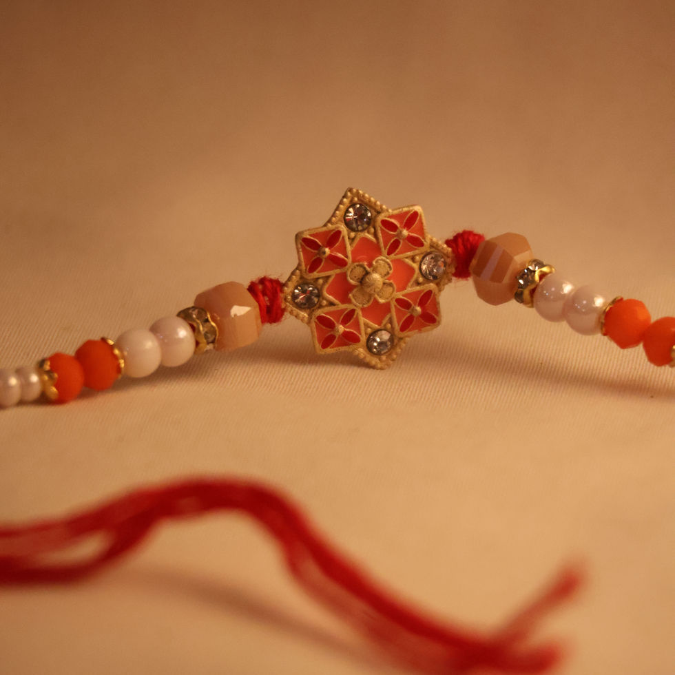 Handmade thread work rakhi crafted for the very special bond between brother and sister. Made in india. Due to the meticulous handcrafting process, our products may exhibit delightful minute imperfections, making each piece truly unique.